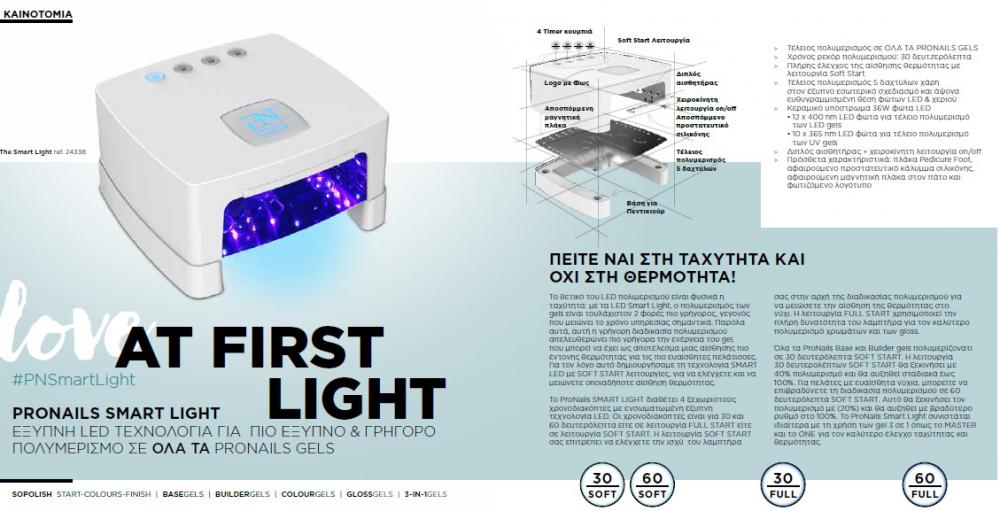 Η SMART LIGHT της ProNails διαθέτει τέσσερα ξεχωριστά κουμπιά με χρονοδιακόπτη και ενσωματωμένη έξυπνη λειτουργία LED. Τα κουμπιά εχουν επιλογή 30 και 60 δευτερόλεπτα είτε σε λειτουργία Full Start είτε σε λειτουργία Soft Start. Η λειτουργία SOFT START, σας επιτρέπει να ελέγχετε την ισχύ της λάμπας σας στην αρχή της διαδικασίας πολυμερισμού, για να μειώσετε την αίσθηση θερμότητας στο νύχι. Η λειτουργία FULL START χρησιμοποιεί την ύψιστη ισχύ της λάμπας για τον βέλτιστο πολυμερισμό των χρωμάτων και των gloss.