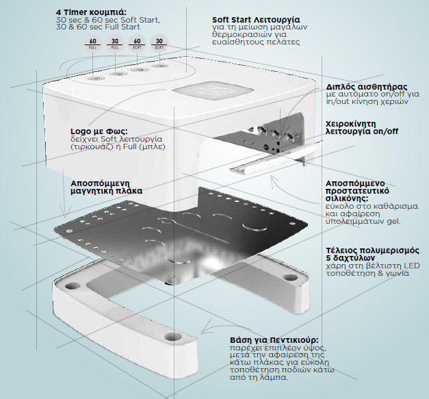 Το SMART LIGHT της ProNails διαθέτει τέσσερα ξεχωριστά κουμπιά χρονοδιακόπτη με ενσωματωμένη έξυπνη λειτουργία LED. Τα κουμπιά χρονοδιακόπτη βγαίνουν σε 30 και 60 δευτερόλεπτα είτε σε λειτουργία Full Start είτε σε λειτουργία Soft Start. Η λειτουργία SOFT START, σας επιτρέπει να ελέγχετε την ισχύ της λάμπας σας στην αρχή της διαδικασίας πολυμερισμού, για να μειώσετε την αίσθηση θερμότητας στο νύχι. Η λειτουργία FULL START χρησιμοποιεί την ύψιστη ισχύ της λάμπας για τον βέλτιστο πολυμερισμό των χρωμάτων και των gloss.