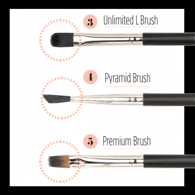 | 3. UNLIMITED L BRUSH • Τέλεια εφαρμογή για Base, Colours και Gloss Gels Το N°3 είναι λίγο πιο φαρδύ από το N°2 και τέλειο για εφαρμογή base gels, χρωματιστά gels and gloss gels. Σας δίνει τη δυνατότητα να δουλεύετε πολύ γρήγορα και θα μπορείτε να εφαρμόσετε gel κοντά στα επωνύχια. 4. PYRAMID BRUSH