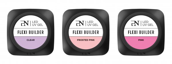 Τα gel χτισίματος FLEXI είναι και δυνατά και εύκαμπτα και παρέχουν μέγιστη αντοχή και ελαστικότητα σε όλα τους τύπους νυχιού. Πολυμερίζονται όλα σε λάμπες LED & UV. Πολυμερίζονται για 60 δευτερόλεπτα στη λάμπα THE LIGHT (LED/CCFL) της ProNails και για 2 λεπτά σε λάμπες UV. Εφαρμόζονται πάνω από τα gel βάσης της ProNails (Perfect Base, Clear Base ή Pink Base) για μέγιστη προσκόλληση στο νύχι.  Είναι τέλεια για επέκταση με φόρμες νυχιών και βγαίνουν σε τρία διαφορετικά χρώματα: CLEAR, PINK και FROSTED PINK και είναι διάφανα στο φυσικό νύχι. Εφαρμόζονται και πολυμερίζονται δάχτυλο-δάχτυλο ή τα τέσσερα δάχτυλα μαζί και οι αντίχειρες ξεχωριστά. Τα gel χτισίματος Flexi είναι ιδανικά για μαθήτριες και αρχάριες τεχνίτριες.
