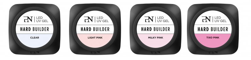 Τα HARD BUILDER gel είναι πολύ σκληρά gel χτισίματος, κάποια συγκρίνονται με το ακρυλικό και επομένως είναι κατάλληλα για επέκταση του νυχιού με φόρμες. Πολυμερίζονται όλα σε λάμπες LED & UV. Πολυμερίζονται για 60 δευτερόλεπτα στη λάμπα THE LIGHT (LED/CCFL) της ProNails και για 2 λεπτά σε λάμπες UV. Ανάμεσα στα σκληρά gel χτισίματος υπάρχουν κάποια που είναι σκληρότερα από άλλα. Τα σκληρά gel χτισίματος είναι κατάλληλα ως gel βάσης και χτισίματος και εφαρμόζονται συχνότερα πάνω από τα gel βάσης της ProNails (Perfect Base, Clear Base ή Pink Base) για μέγιστη προσκόλληση στο νύχι. Χάρη στην σκληρότητα τους, αυτά τα gel επιτρέπουν τη λεπτή εφαρμογή για πιο φυσικά νύχια. Η σειρά Hard Gel της ProNails περιεχει 4 διαφορετικές αποχρώσεις Clear, Light Pink, Milky Pink και Tixo Pink.