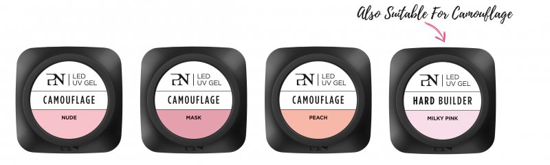 Δεν έχουν όλες την τύχη να έχουν τέλεια φυσικά νύχια και σε αυτή την περίπτωση πρέπει εσείς φυσικά να βοηθήσετε! Με τα camouflage gel της ProNails μπορείτε να μετατρέψετε οποιαδήποτε επιφάνεια νυχιού, είτε κοντή, είτε κατεστραμμένη είτε δαγκωμένη σε ένα φυσικό έργο ίτέχνης! Τα camouflage gel αποτελούνται από τρία διαφορετικά φυσικά χρώματα, Nude, Peach και χρώμα Mask για να ταιριάζει σε οποιοδήποτε χρώμα δέρματος. Αυτά τα σκληρά gel είναι κατάλληλα για όλους τους τύπους νυχιών, ακόμη και για εκεινες που τρώνε τα νύχια τους, και προσφέρουν αντοχή και κάλυψη στο φυσικό νύχι. Χάρη στην καλυπτική τους δυνατότητα και αντοχή, είναι τέλεια για την κάλυψη των ατελειών της κοίτης του νυχιού και για την επέκταση των πολύ κοντών νυχιών. Χρησιμοποιούνται γενικά για φυσικά λουκ ή για γαλλικό μανικιούρ. Αυτά τα gel εφαρμόζονται σε λεπτή στρώση και χρειάζονται ελάχιστο λιμάρισμα. Πολυμερίζονται σε 30 δευτερόλεπτα στη λάμπα The Light (ή για 2 λεπτά σε λάμπα UV) χωρίς να δημιουργείται η αίσθηση της ζέστης.